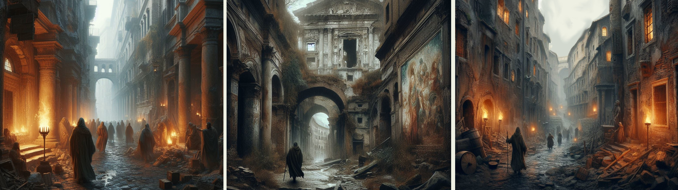 “Gli eventi urbanistici altomedievali furono un succedersi infinito e sovrapposto di distruzioni, smantellamenti, costruzioni, ricostruzioni e interramenti, in una ex-metropoli che da complessa e altamente organizzata viene colpita da eventi naturali e bellici tali da ridurne la popolazione del 95% nell'arco di un tempo relativamente breve. Alla fine del VI Secolo questo grosso calo di popolazione, conseguente alla lunga guerra Greco-Gotica e al sacco di Totila, accompagnati da denutrizione e malattie (peste, vaiolo e soprattutto malaria), rende l'Urbe abbandonata e in parziale incuria. Anche le campagne sono state abbandonate, manca così un approvvigionamento regolare di viveri, accentuando il rischio di carestie. I maestosi complessi monumentali e termali, i teatri, gli stadi ed i lussuosi giardini non hanno più ragione di esistere e richiederebbero una manutenzione impossibile da farsi, per assenza di risorse umane ed economiche. Il sistema fognario e gli acquedotti sono da ripristinare. Del resto tutta l'Italia è in ginocchio. Nonostante ciò, secondo i testimoni dell'epoca, dopo le invasioni, i saccheggi e gli incendi, l'Urbe brilla ancora del suo splendore imperiale. Ma è semideserta; escluse le aree del Velabro, del Foro e del Campo Marzio meridionale, è abitata a macchie di leopardo. Resta il fatto che il periodo che intercorre fra il VI ed il X Secolo, parlando di urbanistica e urbanizzazione, è a noi in gran parte sconosciuto. ” (Thomas)