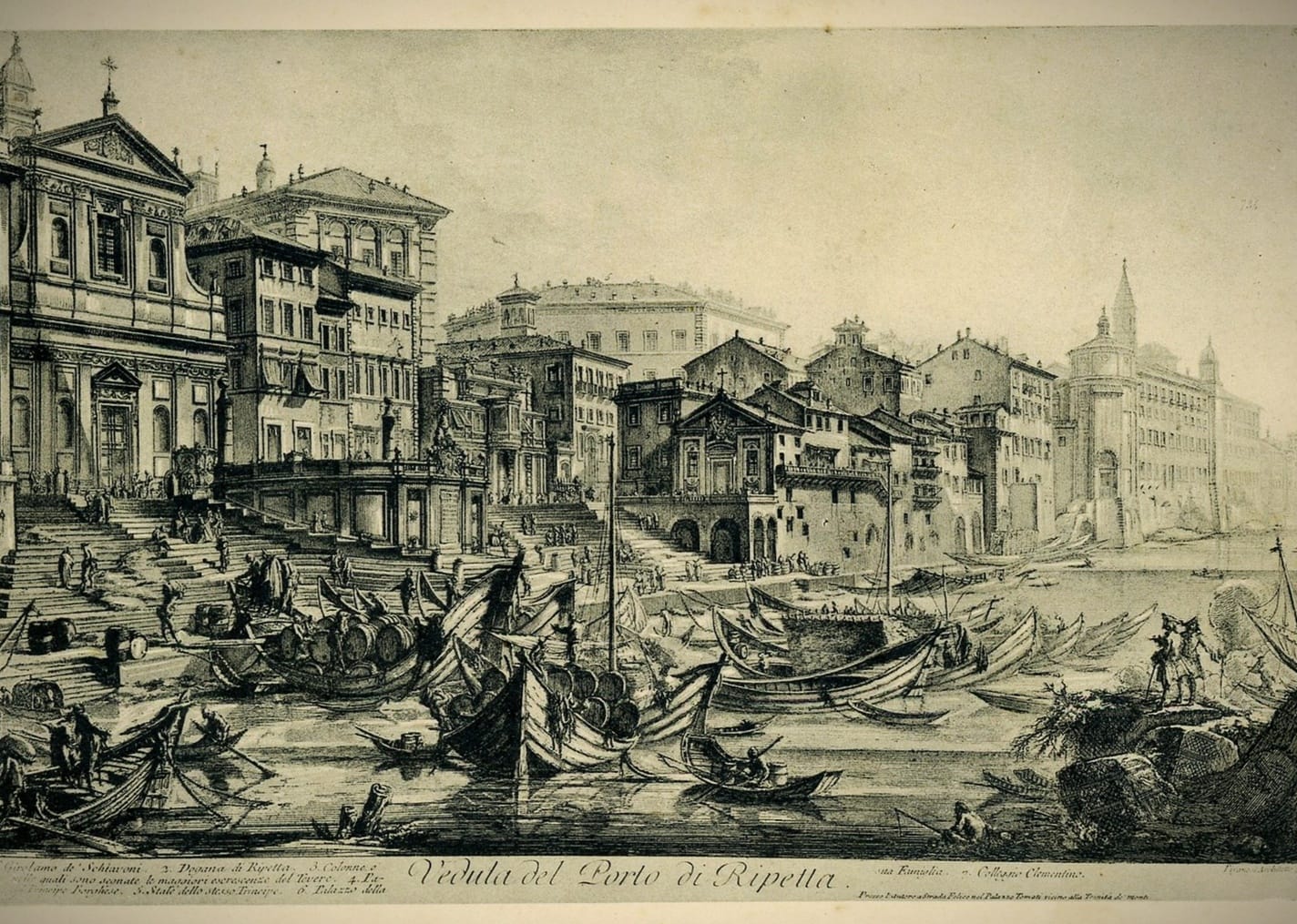 Clemente XI fece ricostruire il Porto di Ripetta in forme monumentali con materiali di spoglio provenienti dal Colosseo (verrà però distrutto nella seconda metà dell'800 per la costruzione dei Muraglioni). La costruzione della scalinata di Trinità dei Monti, ad opera di Francesco De Sanctis fu la conclusione ideale del progetto del Tridente, insieme ai lavori del porto, con la sensibilità barocca dei "giardini urbani" (1723-26). Un'altra opera imponente, che si innestava su un acquedotto romano, è la Fontana di Trevi, conclusa a metà del Settecento. Sotto Benedetto XIV il progetto barocco si poté dire completato. In questi anni (1748) il cartografo Nolli documentò minuziosamente il tessuto urbano. Clemente XI rinnovò inoltre anche l'altro porto, quello di Ripa Grande, che venne da lui dotato dell'Arsenale.